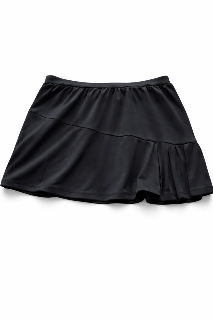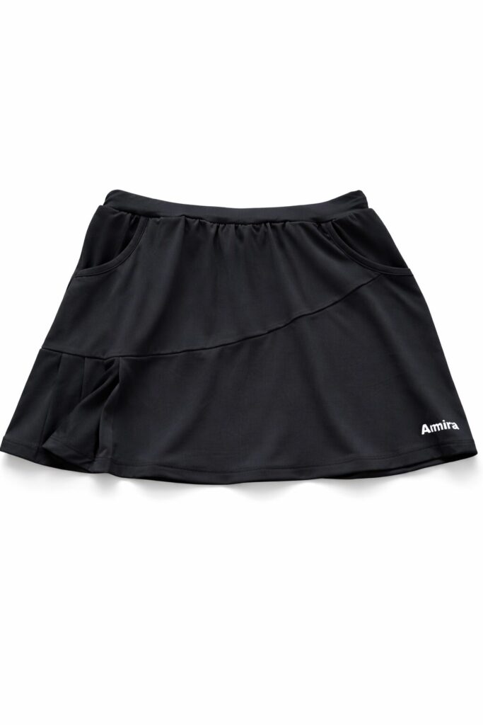 一見シンプルなブラックですが、よく見ると斜めの切り返しが入っていて、サイドから後ろにかけて部分的なプリーツが施されています。このさりげないデザインが、絶妙に可愛い!シンプルなのにどこか品があって、テニスウェアらしさの中にもおしゃれ感があります。