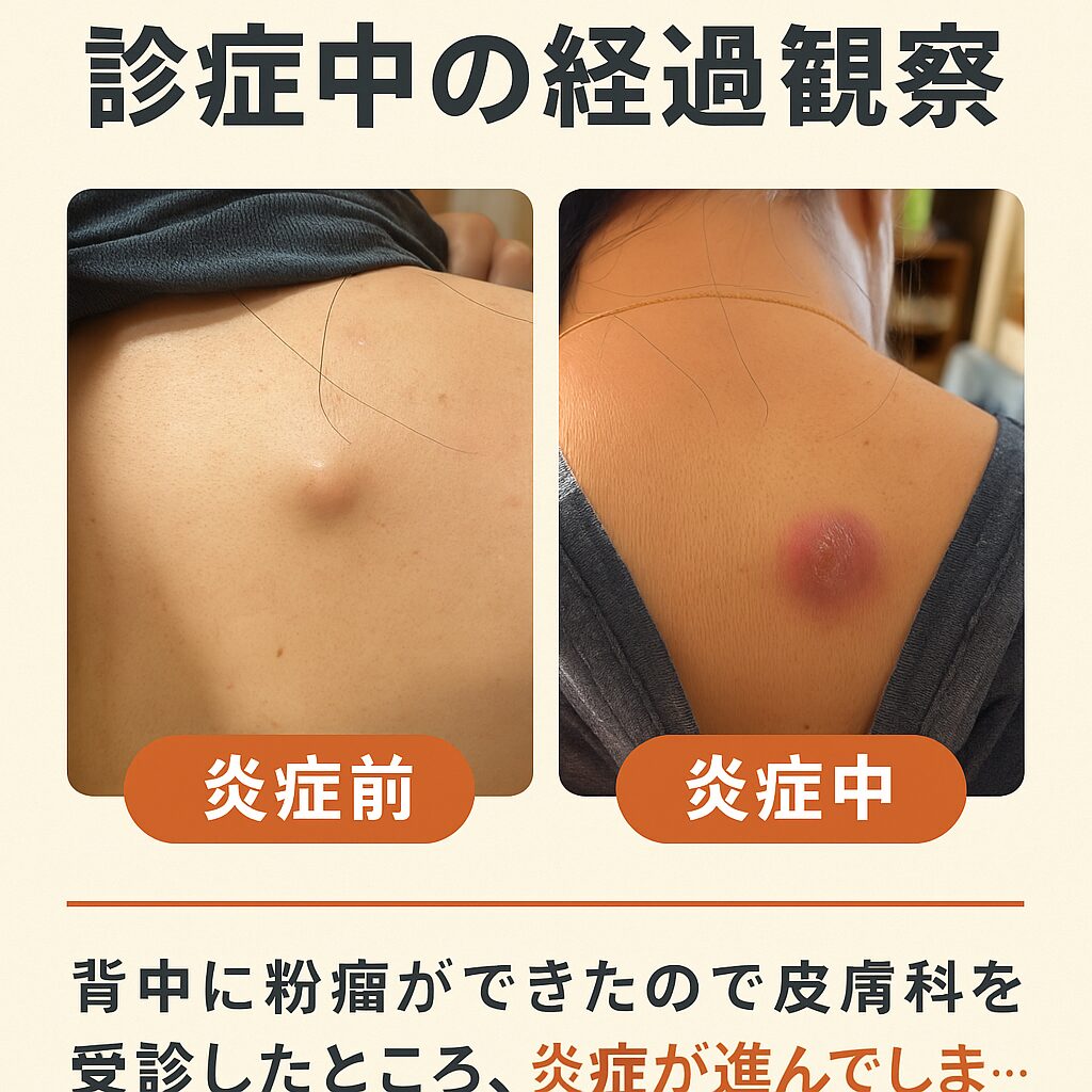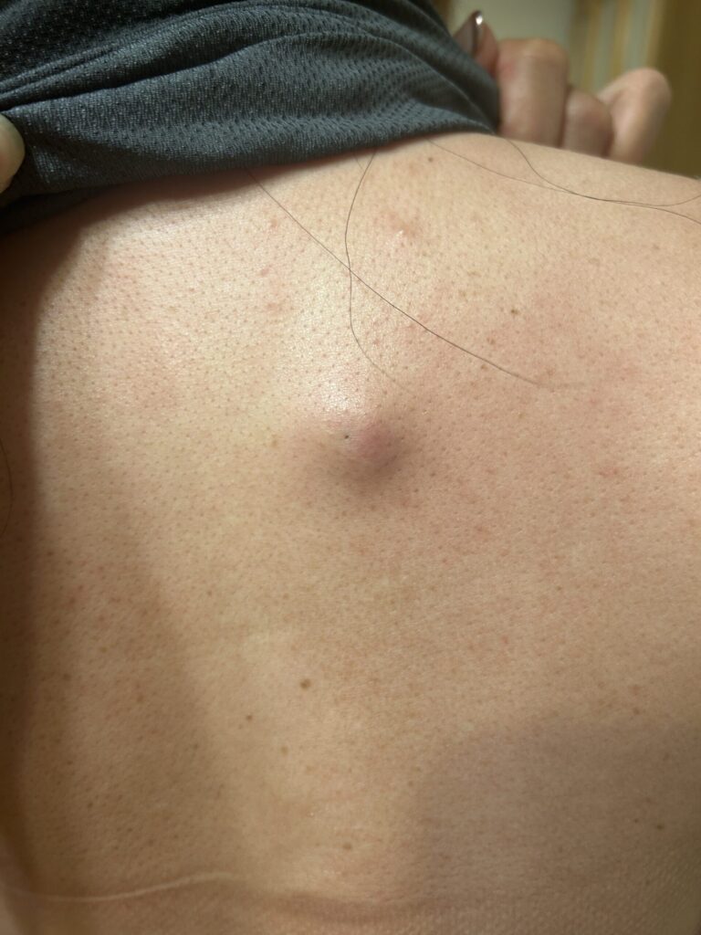 1ヶ月ほど前、ベッドに横になったときに「なんか当たるな」と思って触ってみると、背中にぷっくりとした膨らみが…。娘に写真を撮ってもらい、調べたら 粉瘤(アテローマ) らしきもの。