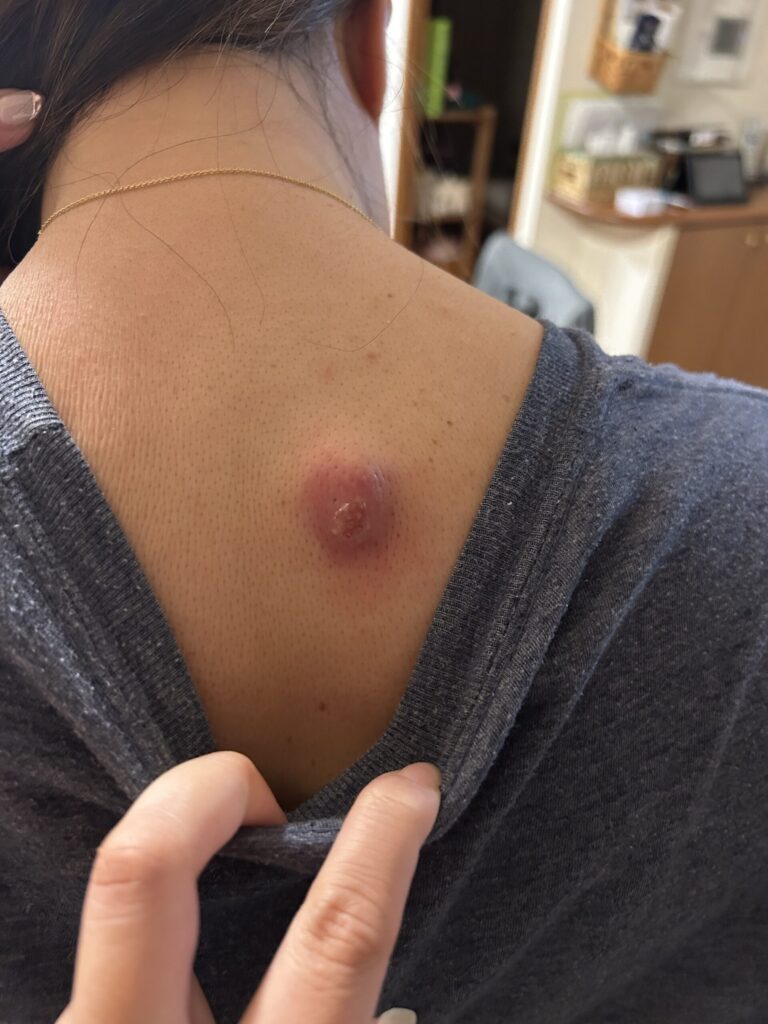 - 赤く腫れて皮が剥けてきた炎症中の粉瘤